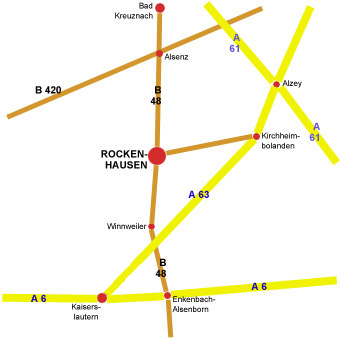 - nach Norden über die B 48 Richtung Bad Kreuznach bis Rockenhausen (ca. 12 km)